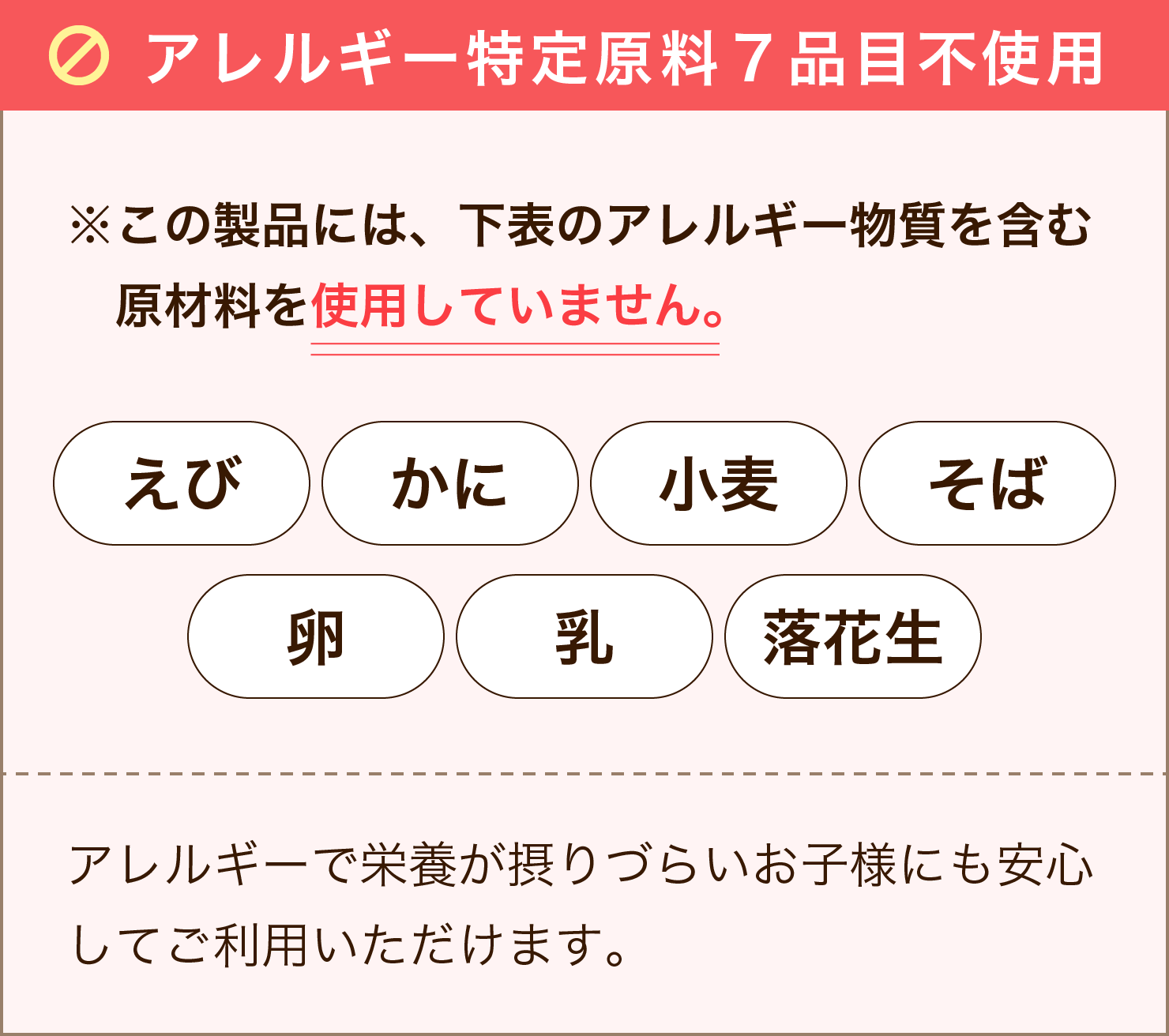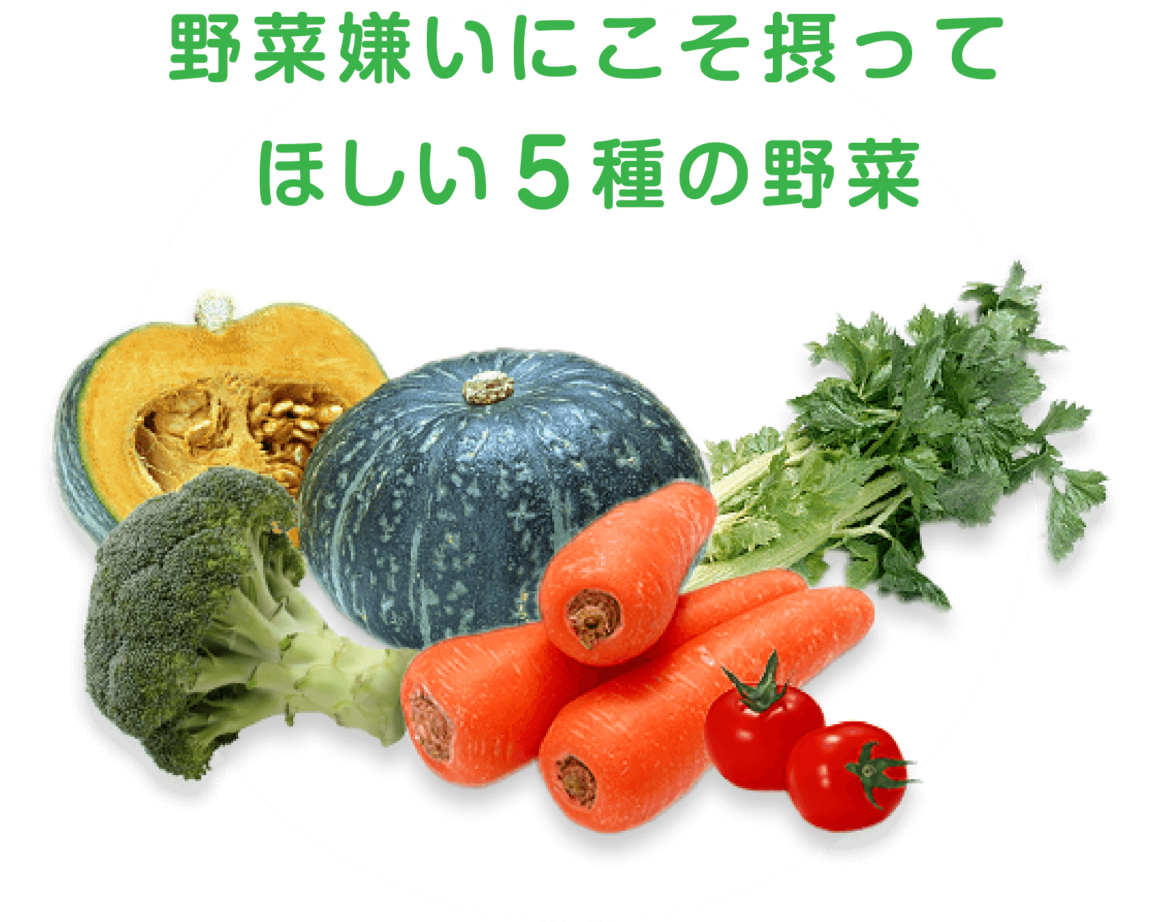 幼児期のお悩みの中でも多いのが「野菜嫌い」。ビタミンなど栄養たっぷりの野菜を食べて欲しいというママ達の声を聞いて、にんじん、かぼちゃ、セロリ、ブロッコリー、トマトの5種類の野菜をブレンドしました。