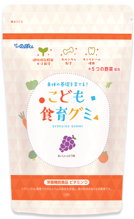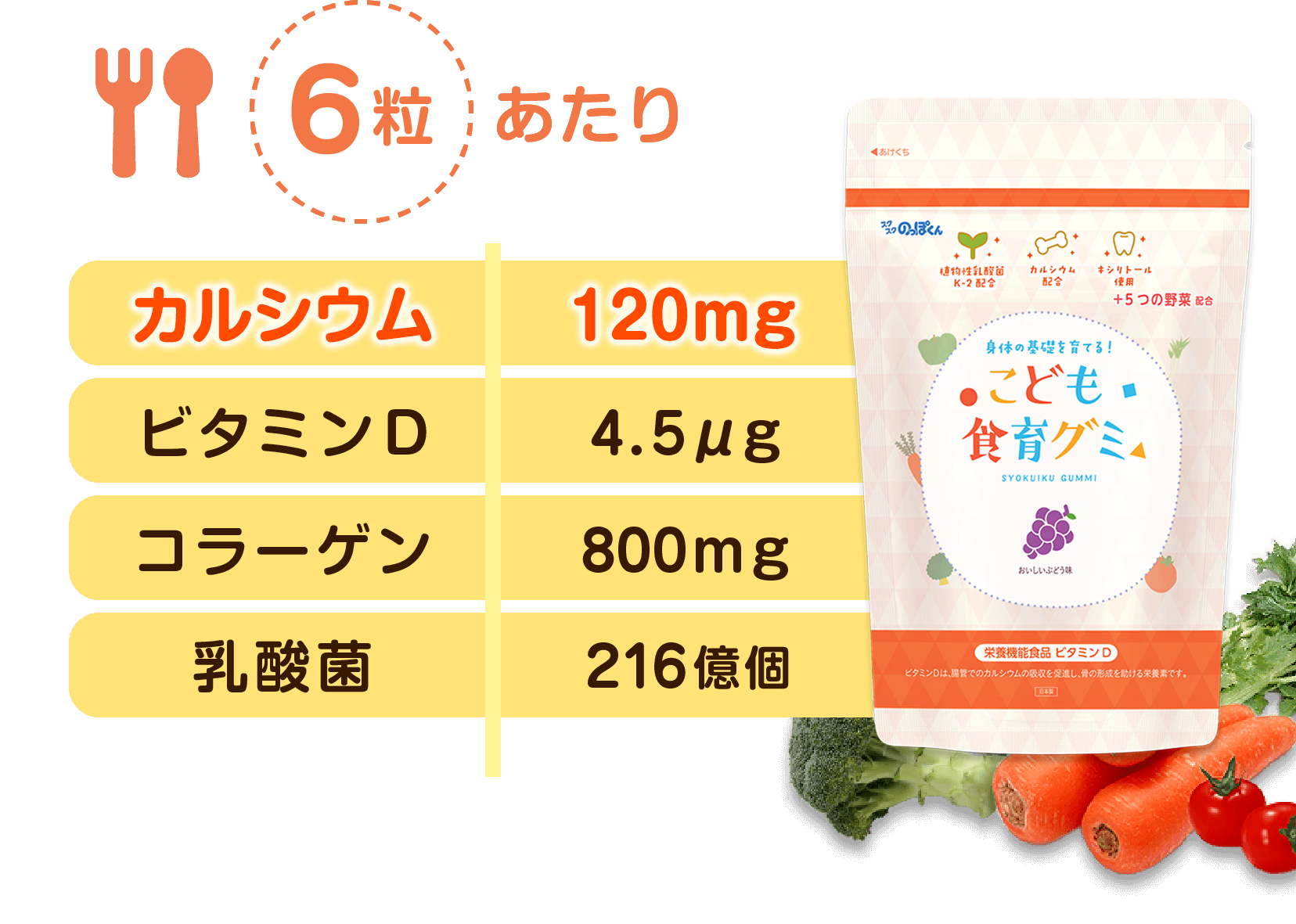 こども食育グミは、土台を作るコラーゲンとカルシウム、カルシウムの体への吸収を助けるビタミンDを配合。お子様の体を支えるための丈夫な成長を考えました。