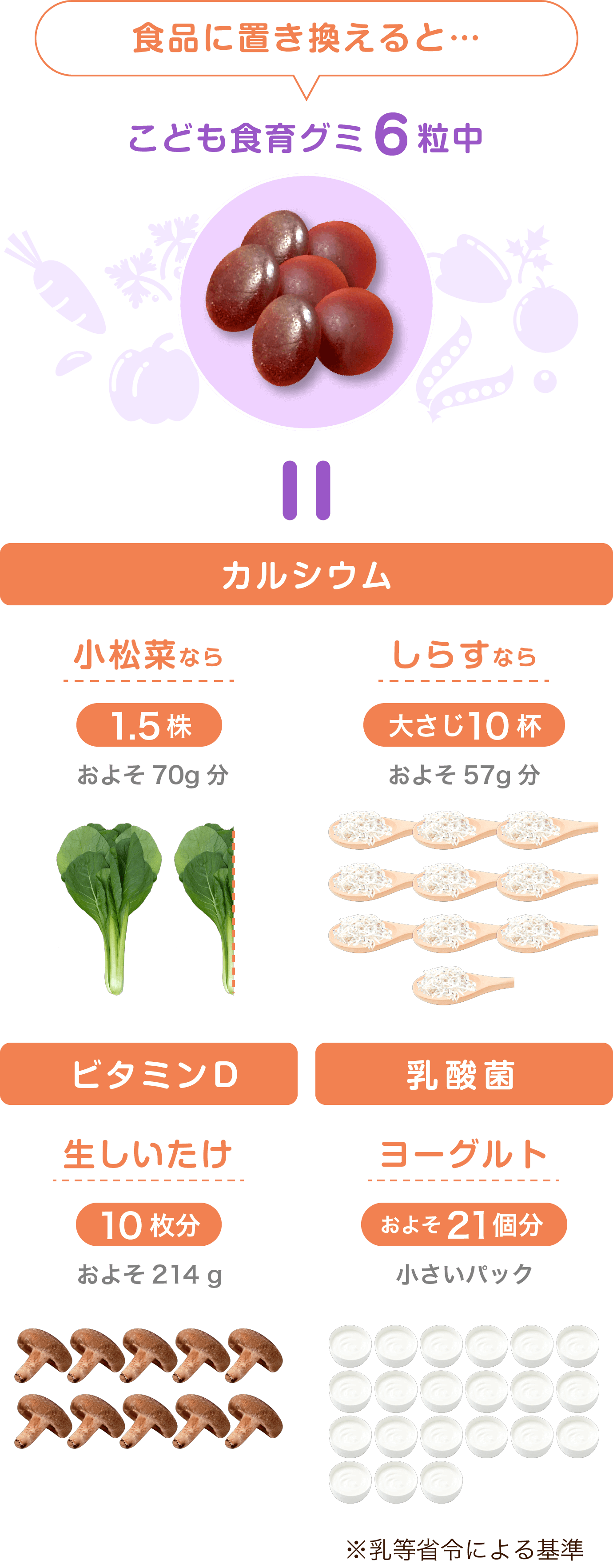 1日当たり4〜6粒を目安にのどにつまらせないように1粒ずつよく噛んでお召し上がりください。お子様が上手に噛みくだき、飲み込めるようになるまでは、必ず見守ってあげてください。