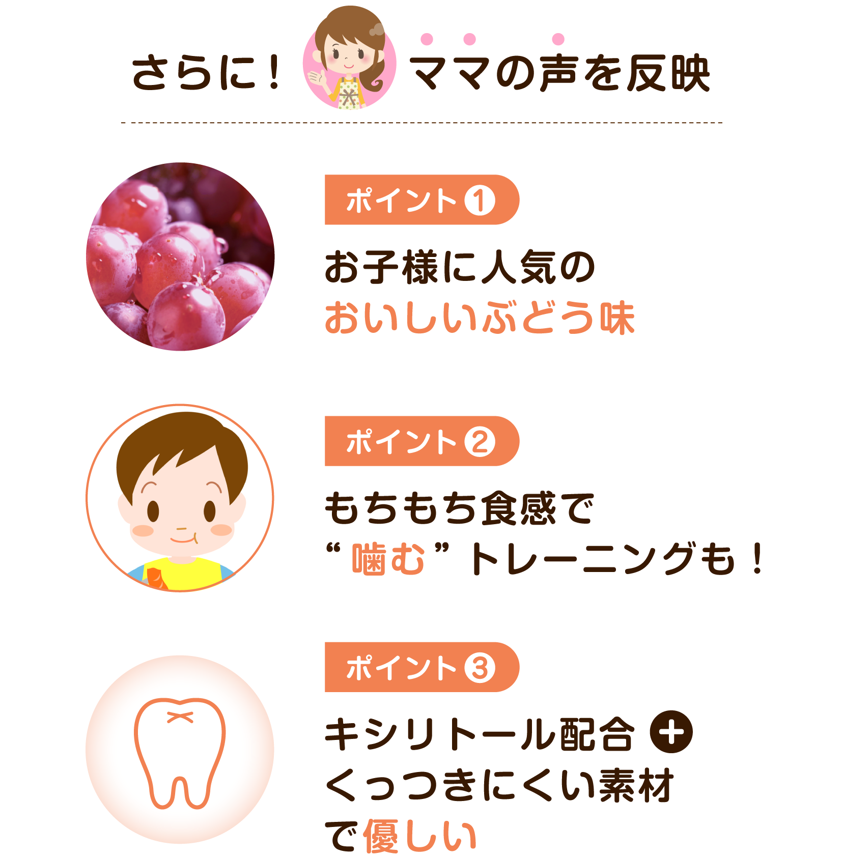 大好きなグミと大好きなぶどうの味で、うちの子には毎日かかせない栄養おやつになっています。保育園でも毎日食べています!体質的に牛乳が合わない子ですが、植物性の乳酸菌もたっぷり入っていてとても助かっています♪