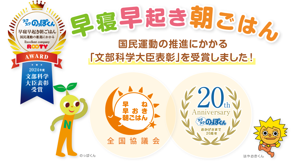 この度、スクスクのっぽくんが、令和6年度、優れた「早寝早起き朝ごはん」運動の推進にかかる「文部科学大臣表彰」を受賞しました!子どもたちの健やかな成長には、「早寝早起き朝ごはん」をはじめ、十分な睡眠・バランスのとれた食事・適度な運動など、規則正しい生活習慣がとても大切です。私たちが所属する「早寝早起き朝ごはん」全国協議会では、文部科学省と連携し、子どもの生活習慣を改善するための国民運動を推進しています。